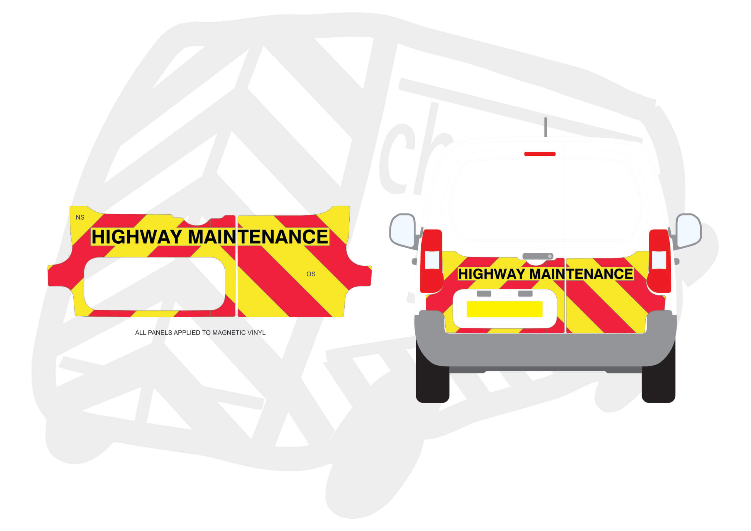 (Standard Kit) Up to windows panels only of 150mm Chevrons in Fluorescent Yellow and Engineering Grade Red Reflective, incorporating ‘Highway Maintenance’ text in black gloss – All applied onto magnetic.