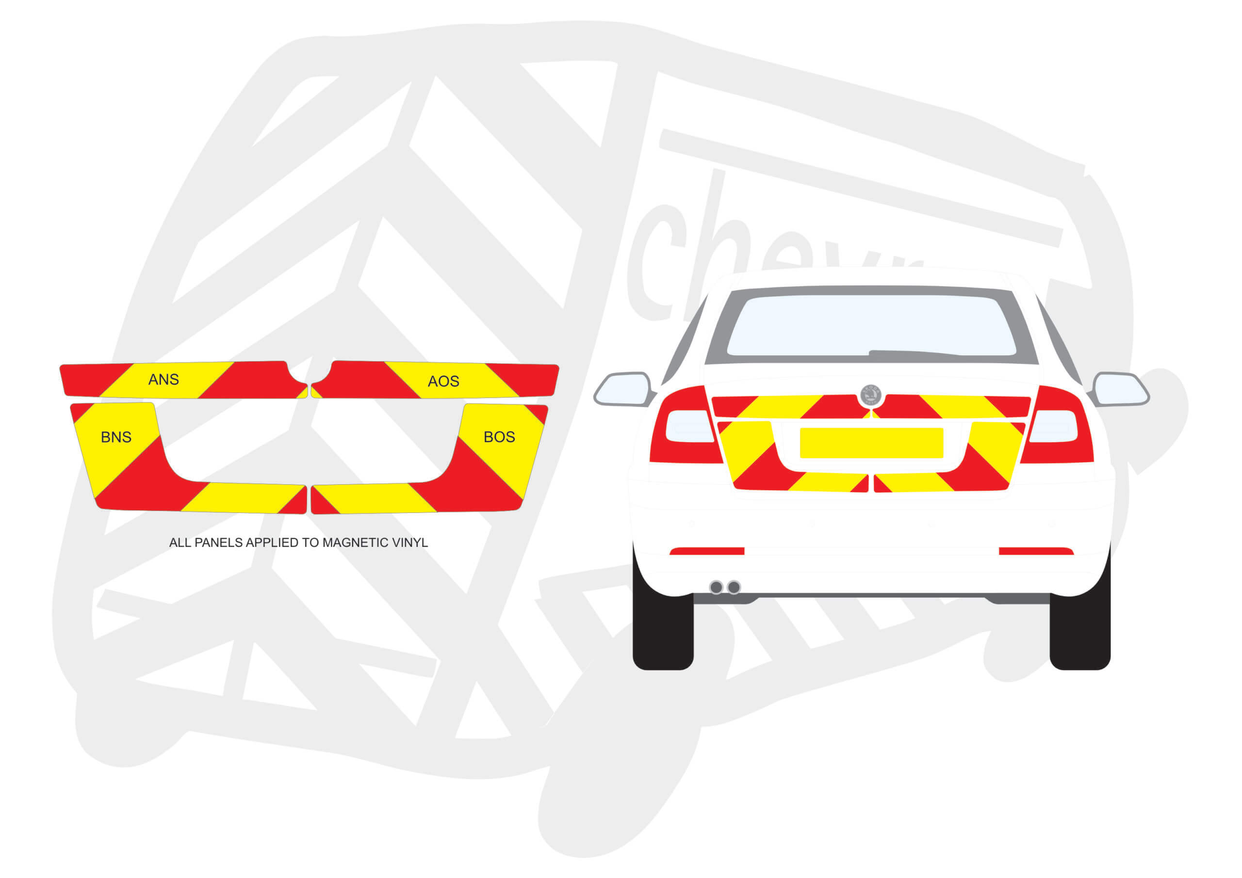 (Standard Kit) Up to windows panels only of 150mm Chevrons in Fluorescent Yellow and Engineering Grade Red Reflective – All applied onto magnetic.