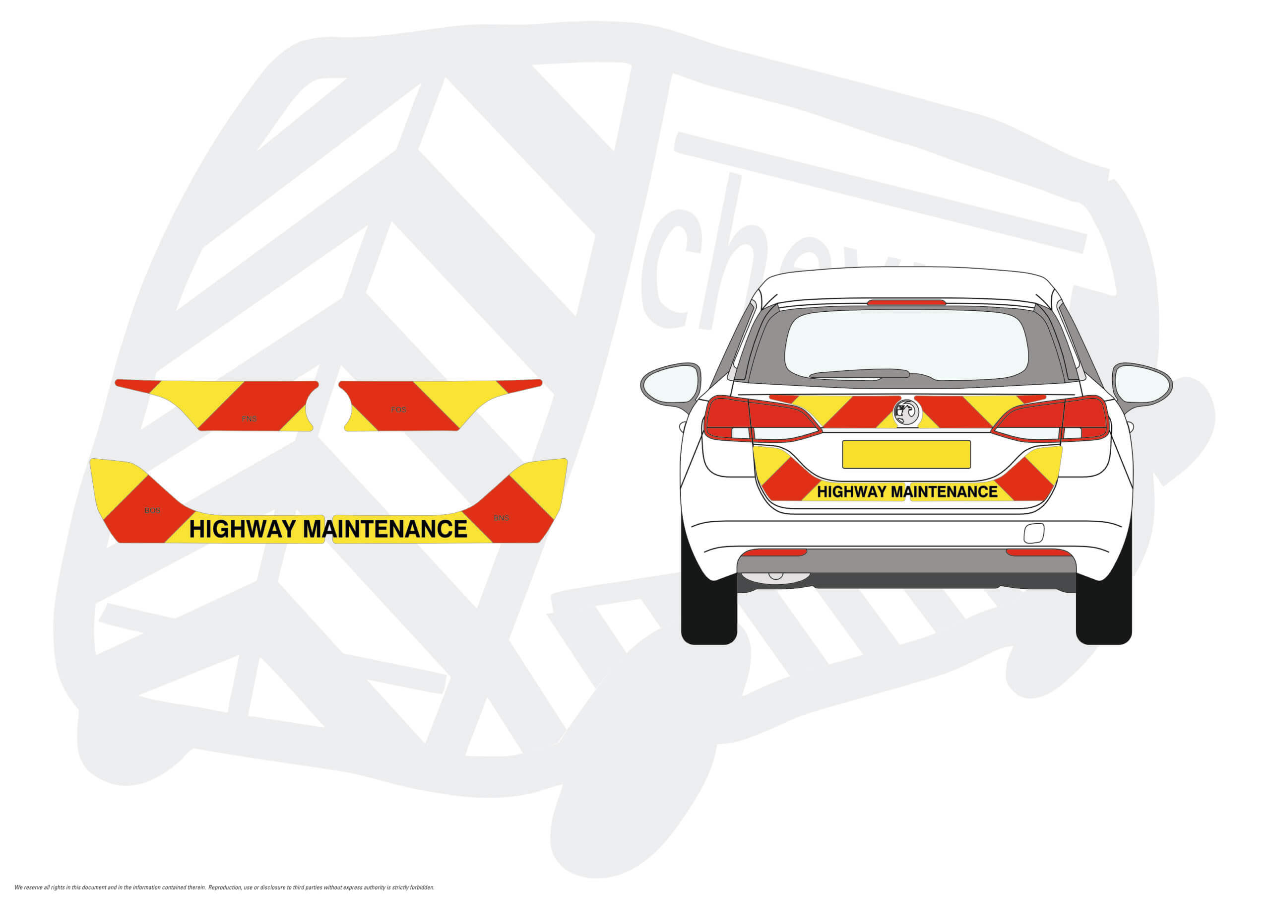 (Standard Kit) Up to windows panels only of 150mm Chevrons in Fluorescent Yellow and Engineering Grade Red Reflective, incorporating HIGHWAY MAINTENANCE text in black gloss non-reflective.