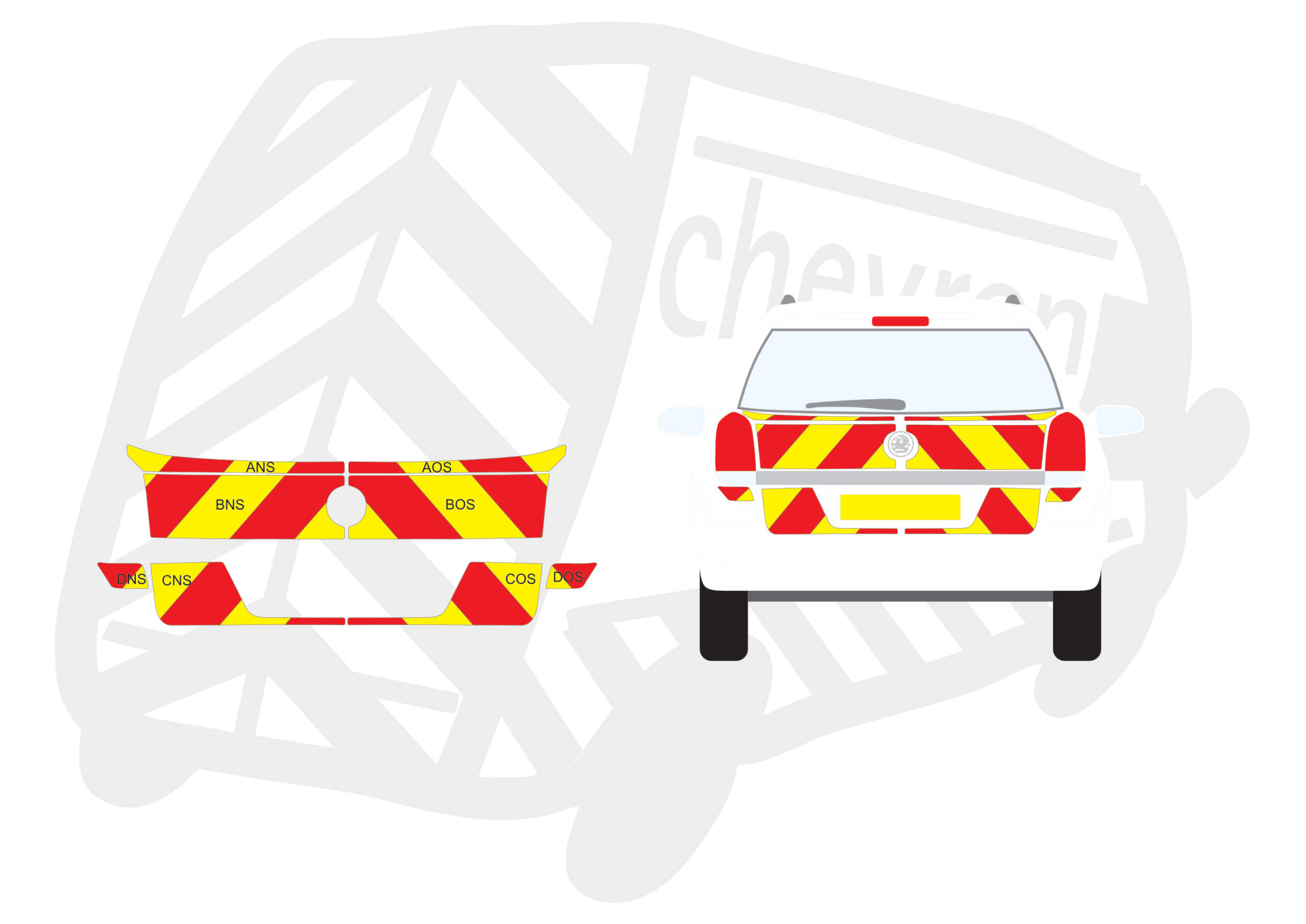 (Standard Kit) Up to windows only 150mm Chevrons in Fluorescent Yellow and Engineering Grade Red Reflective