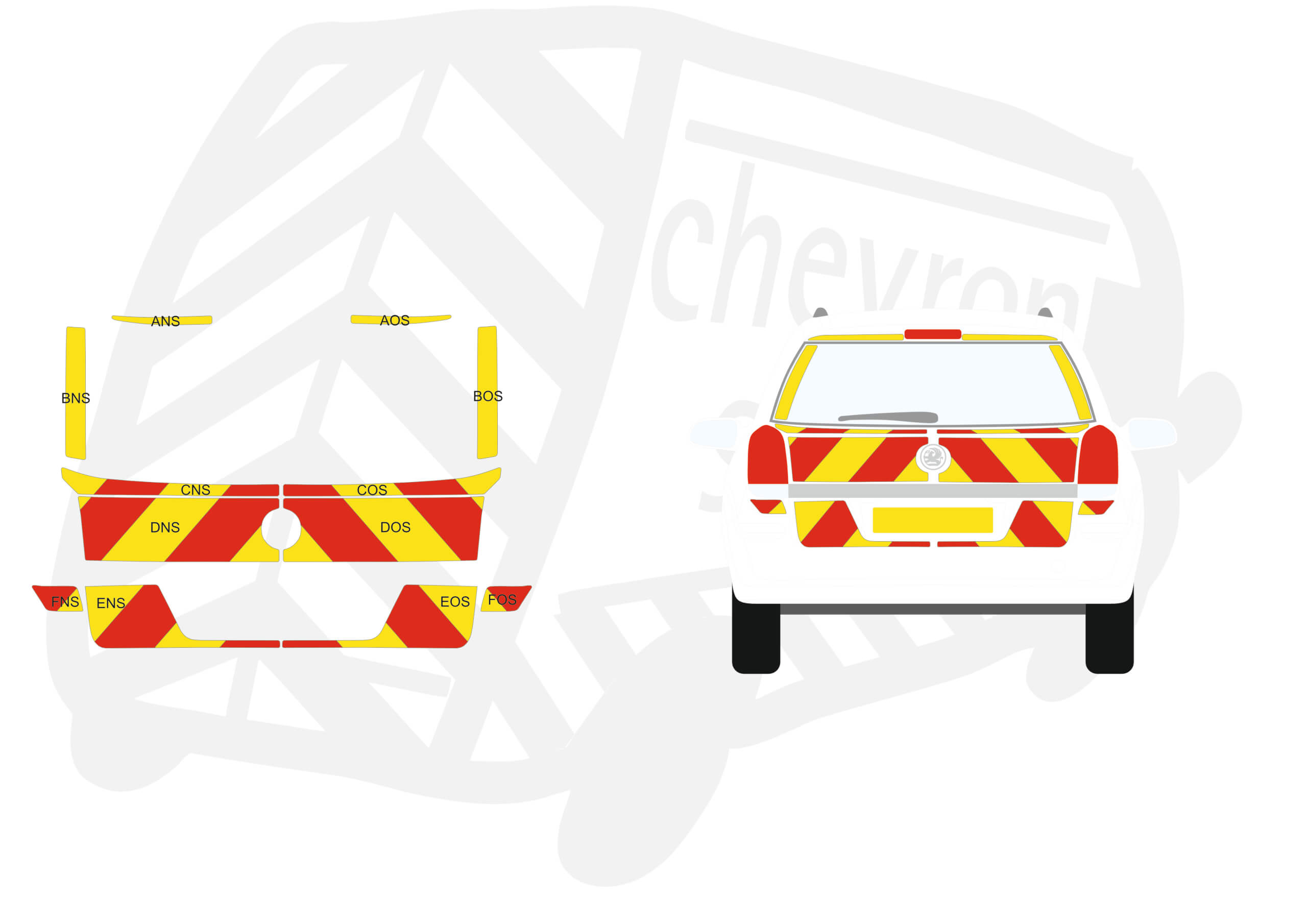 (Standard Kit) Below windows and surrounds 150mm Chevrons in Fluorescent Yellow and Engineering Grade Red Reflective