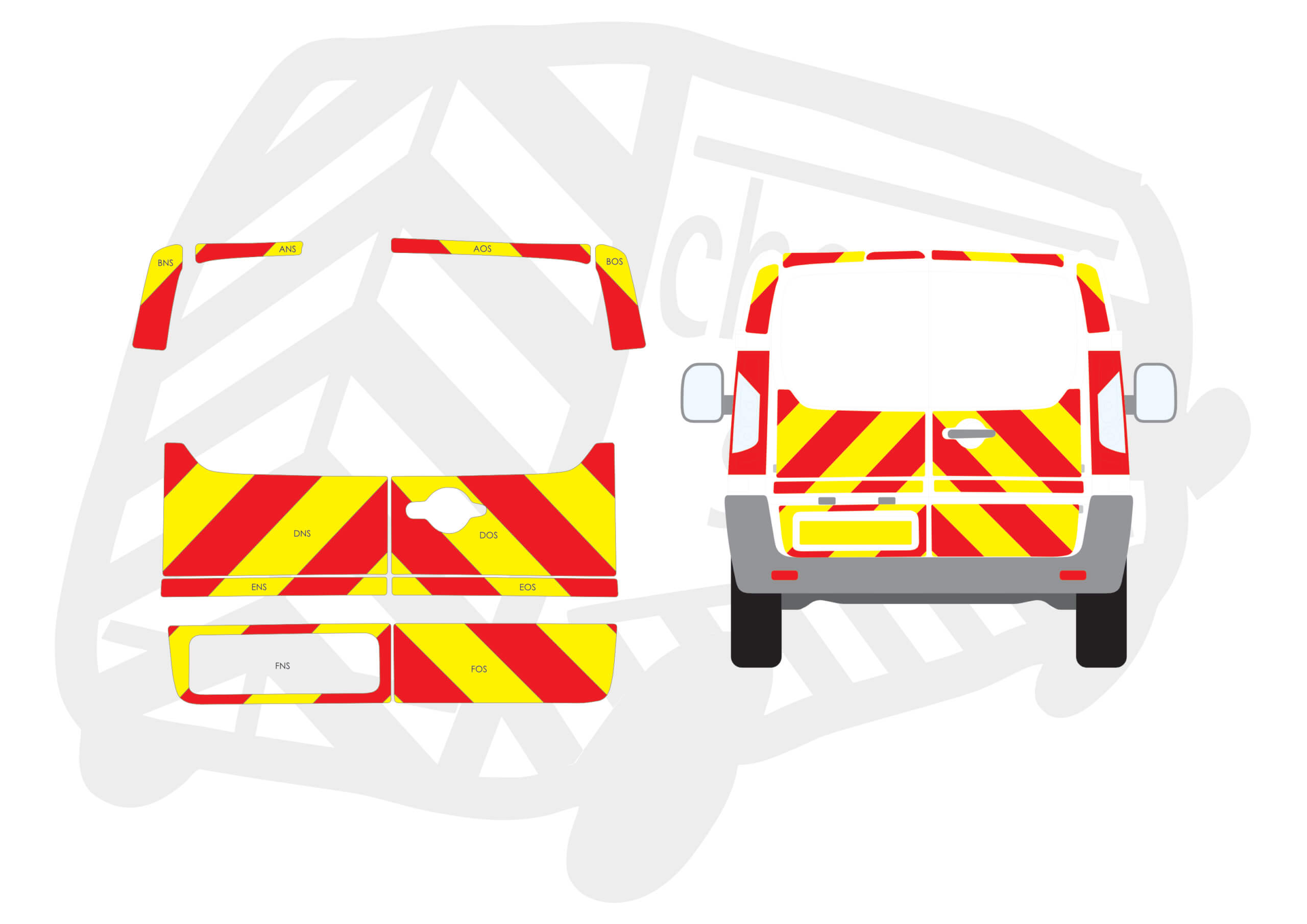 (Standard Kit) Up to windows and surrounds 150mm Chevrons in Fluorescent Yellow and Engineering Grade Red Reflective.