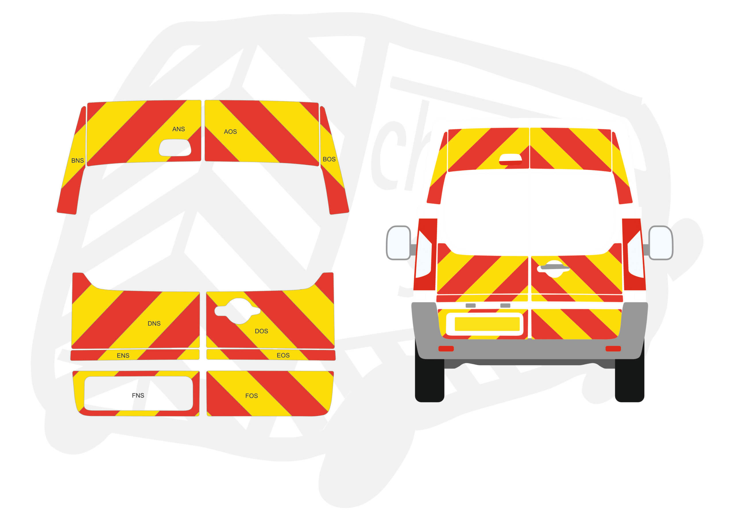 (Standard Kit) Up to windows and surrounds 150mm Chevrons in Fluorescent Yellow and Engineering Grade Red Reflective, suitable for high roof models.