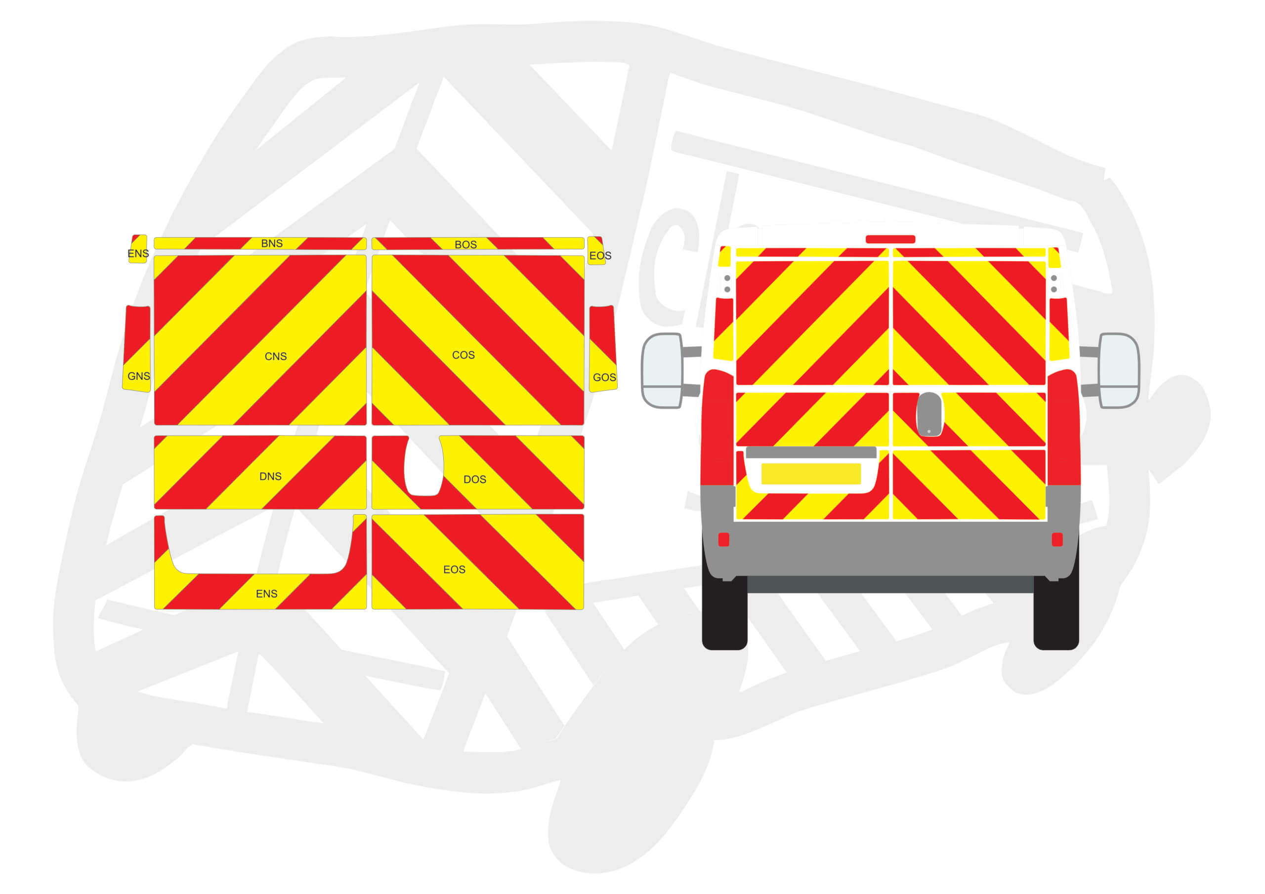 (Standard Kit) Full coverage including window panels of 150mm Chevrons in Fluorescent Yellow and Engineering Grade Red Reflective.
