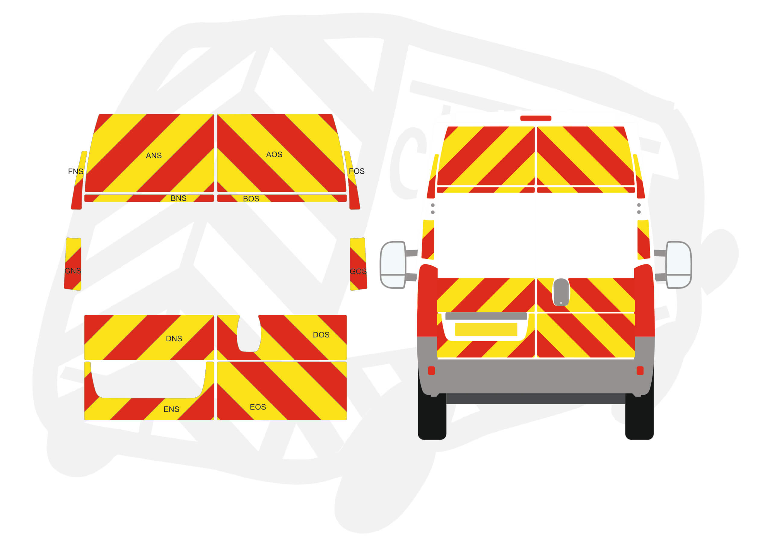 (Standard Kit) Below windows and surrounds of 150mm Chevrons in Fluorescent Yellow and Engineering Grade Red Reflective.