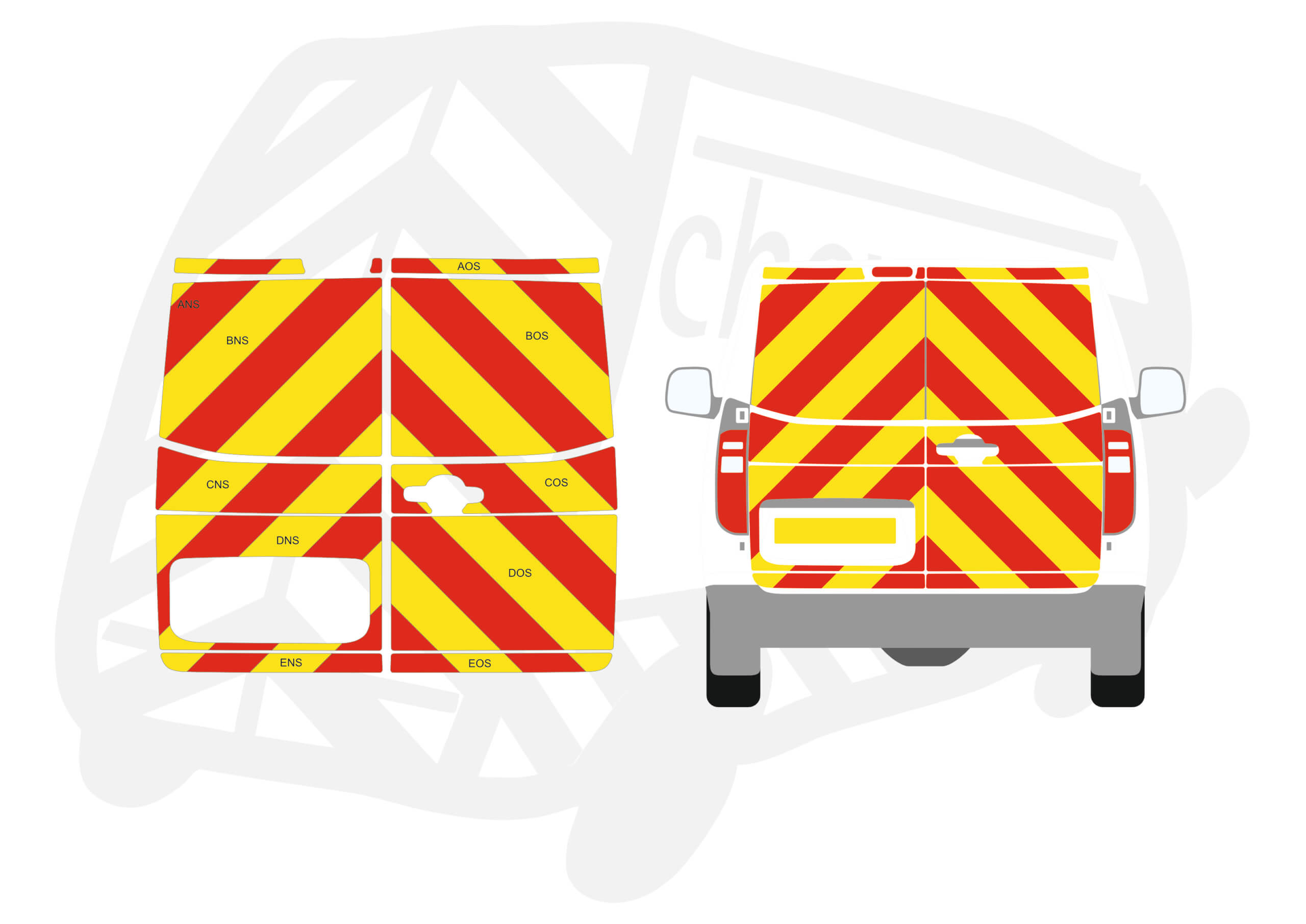 (Standard Kit) Full coverage including window panels of 150mm Chevrons in Fluorescent Yellow and Engineering Grade Red Reflective.
