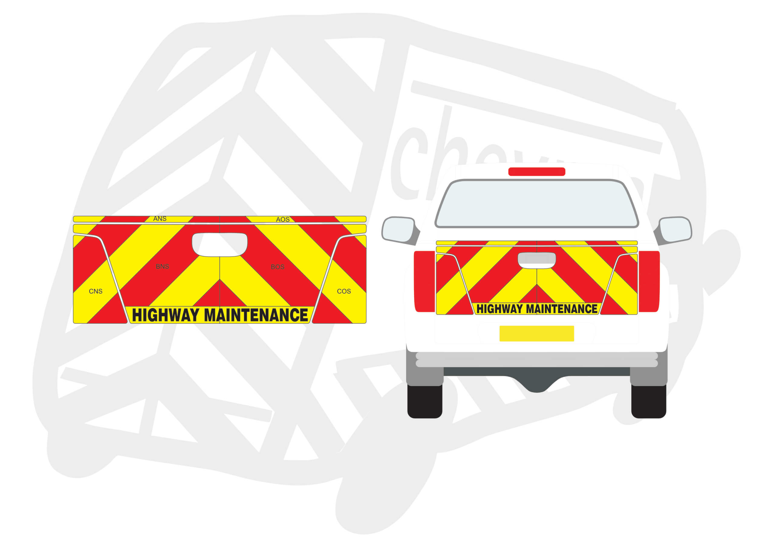 (Standard Kit) Tailgate 150mm Chevrons in Fluorescent Yellow and Engineering Grade Red Reflective, to incorporate ‘Highway Maintenance’ text in black gloss non-reflective.
