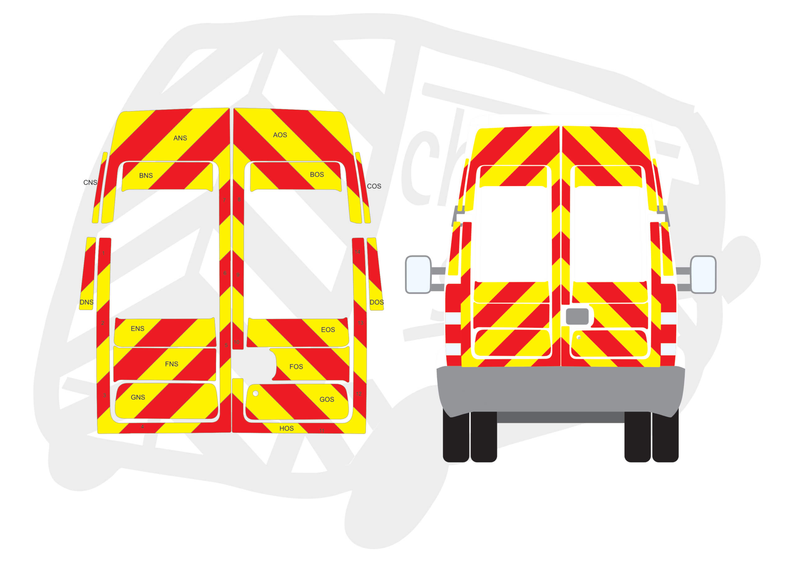 (Standard Kit) Below windows and surrounds of 150mm Chevrons in Fluorescent Yellow and Engineering Grade Red Reflective.