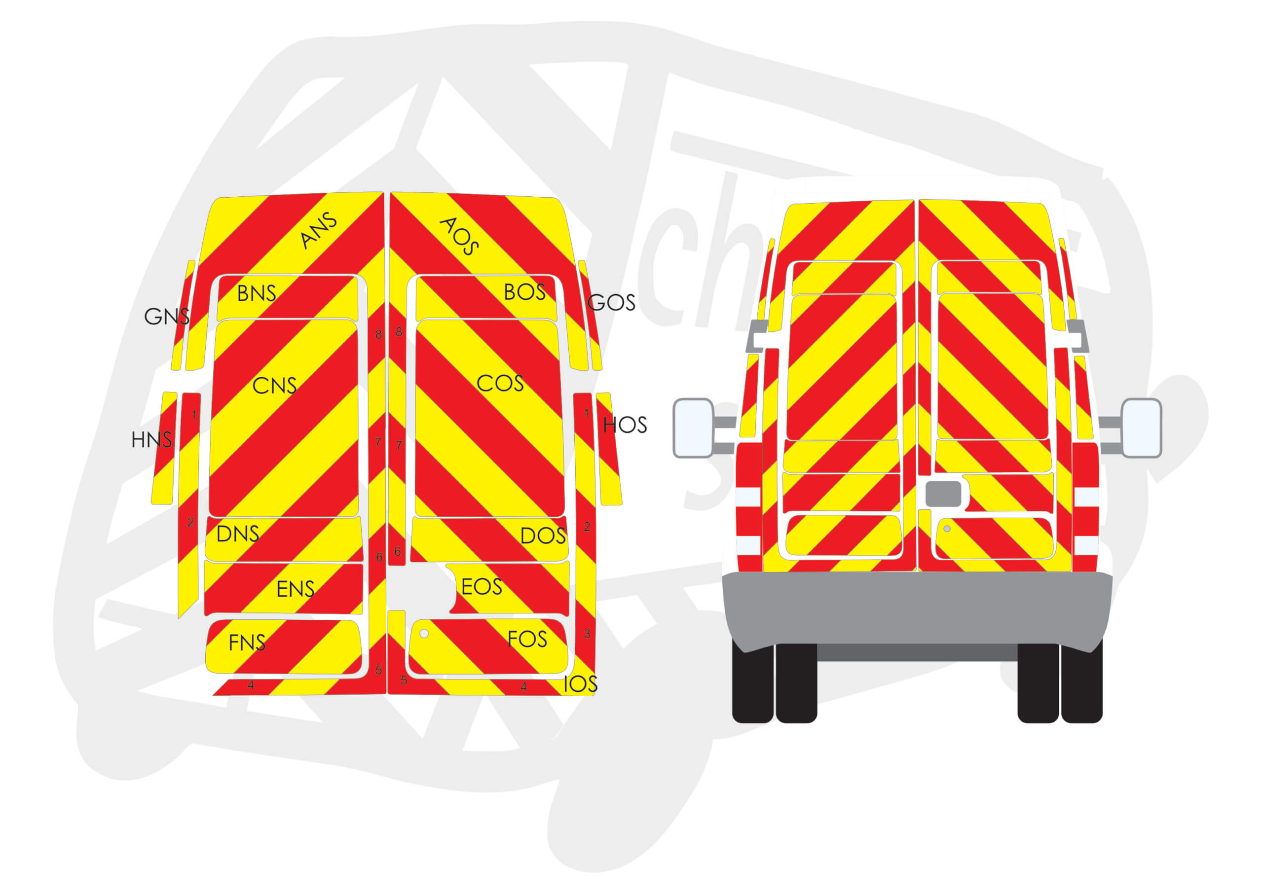 (Standard Kit) Full coverage including window panels of 150mm Chevrons in Fluorescent Yellow and Engineering Grade Red Reflective.