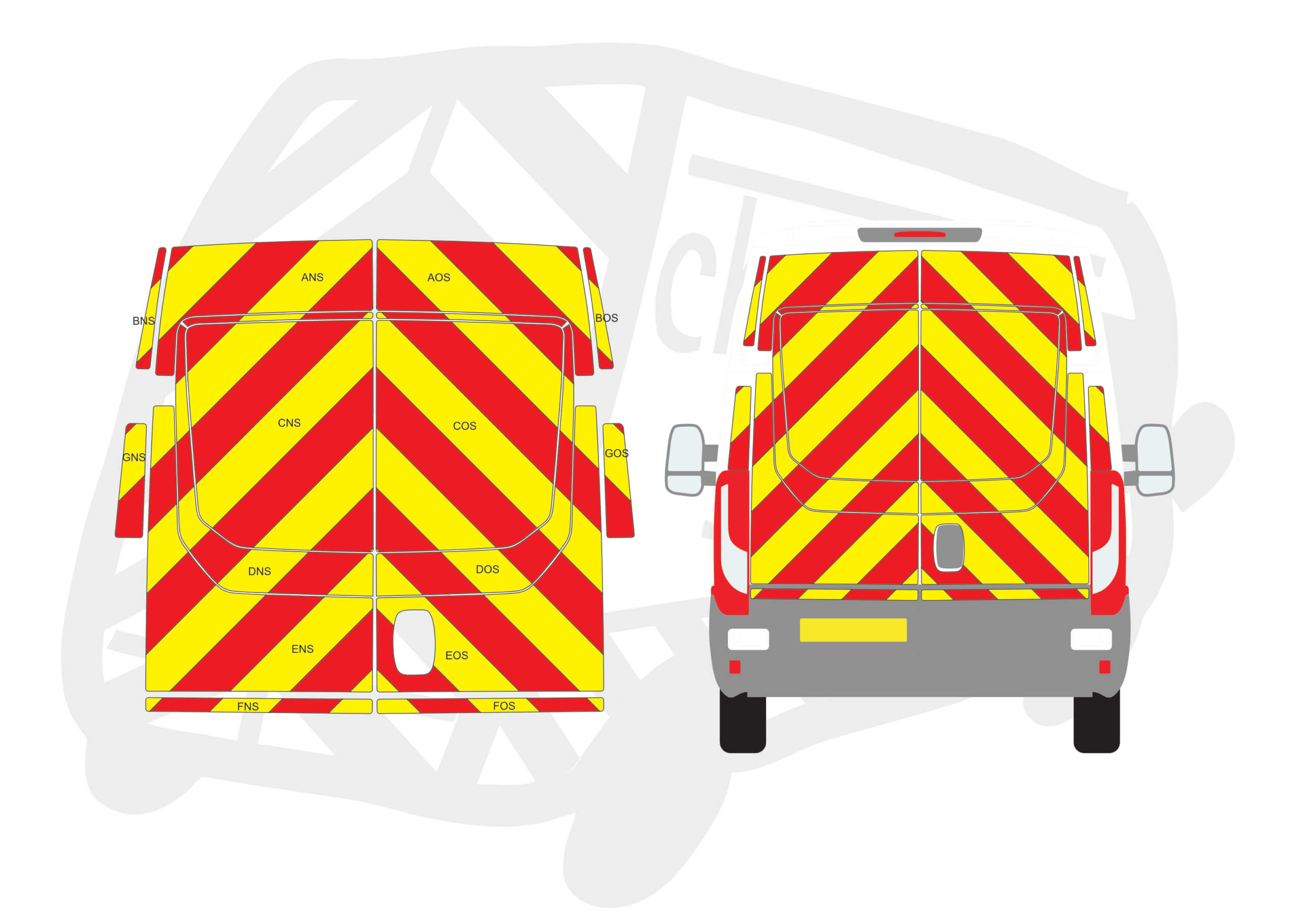 (Standard Kit) Full coverage including window panels of 150mm Chevrons in Fluorescent Yellow and Engineering Grade Red Reflective.
