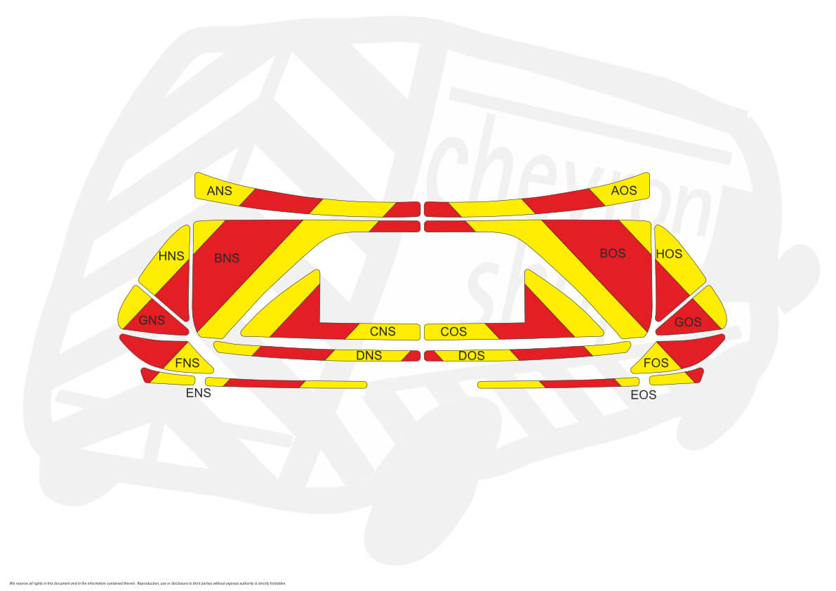 (Standard Kit) Below windows only of 150mm Chevrons in Fluorescent Yellow and Engineering Grade Red Reflective.