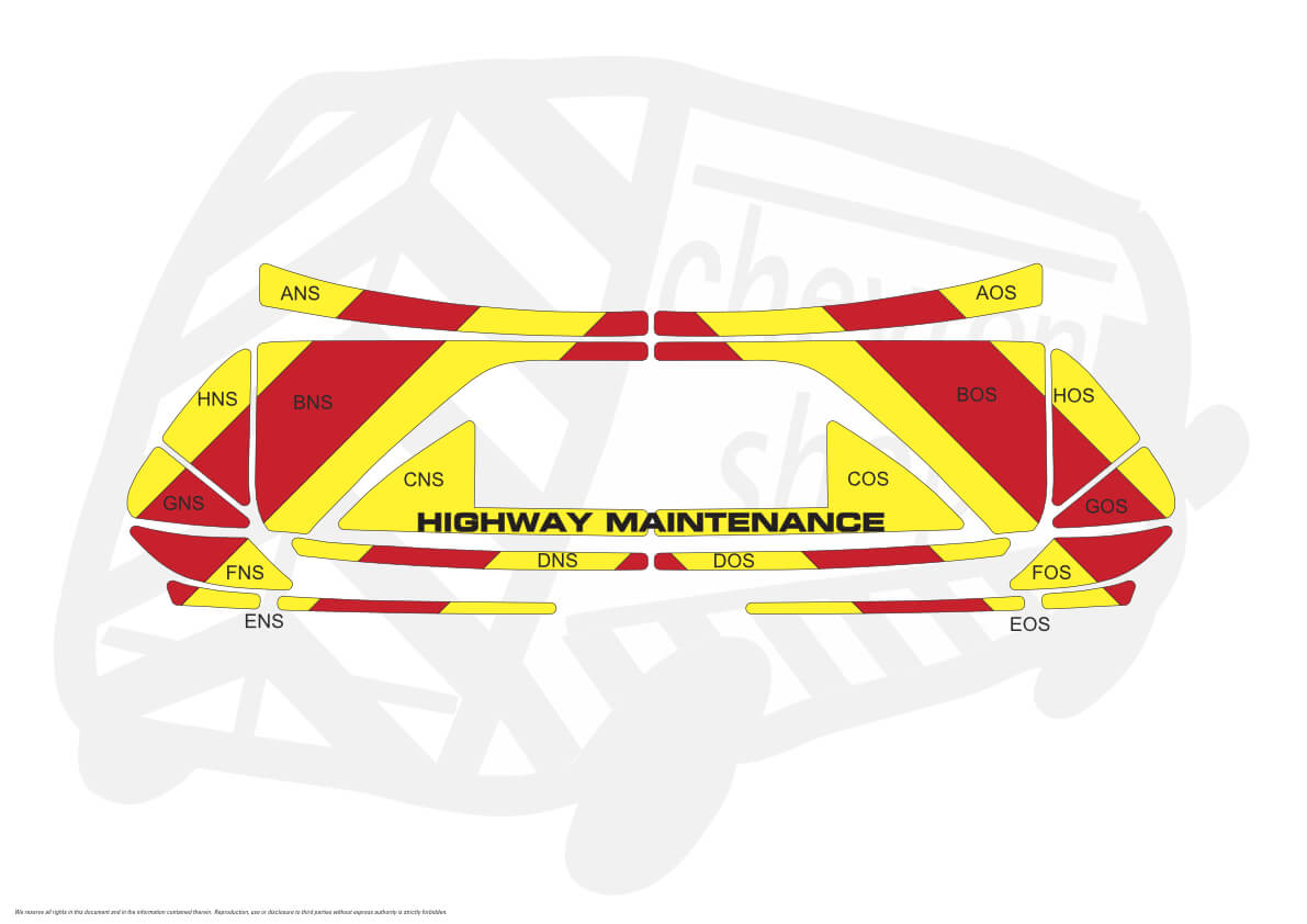 (Standard Kit) Below windows only of 150mm Chevrons in Fluorescent Yellow and Engineering Grade Red Reflective. Incorporating ‘HIGHWAY MAINTENANCE’ text in black gloss non-reflective.