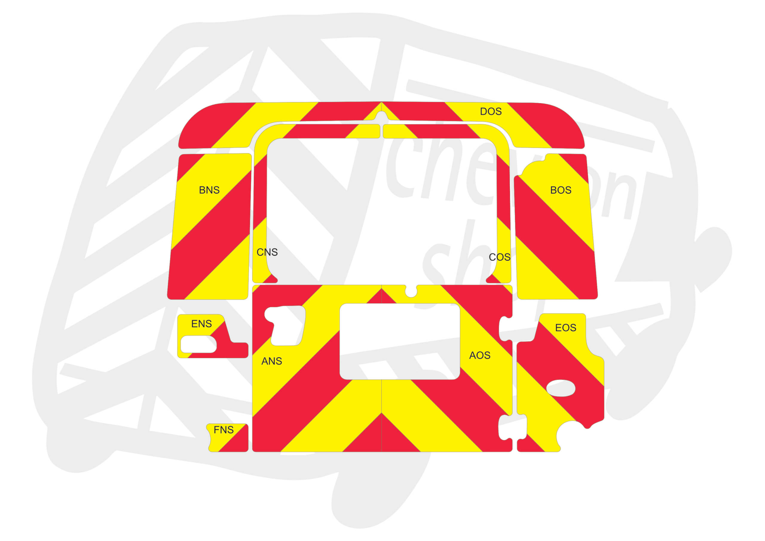 (Standard Kit) Full coverage including windows of 150mm Chevrons in Fluorescent Yellow and Engineering Grade Red Reflective.
