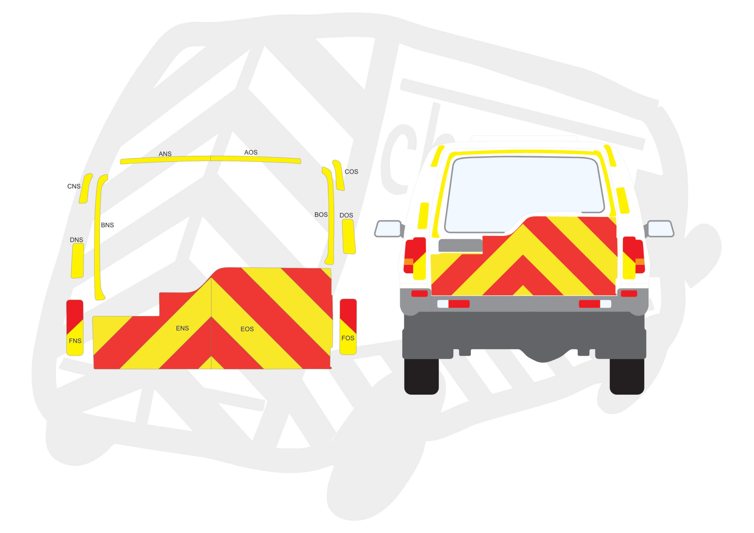 (Standard Kit) Below windows and surrounds of 150mm Chevrons in Fluorescent Yellow and Engineering Grade Red Reflective.