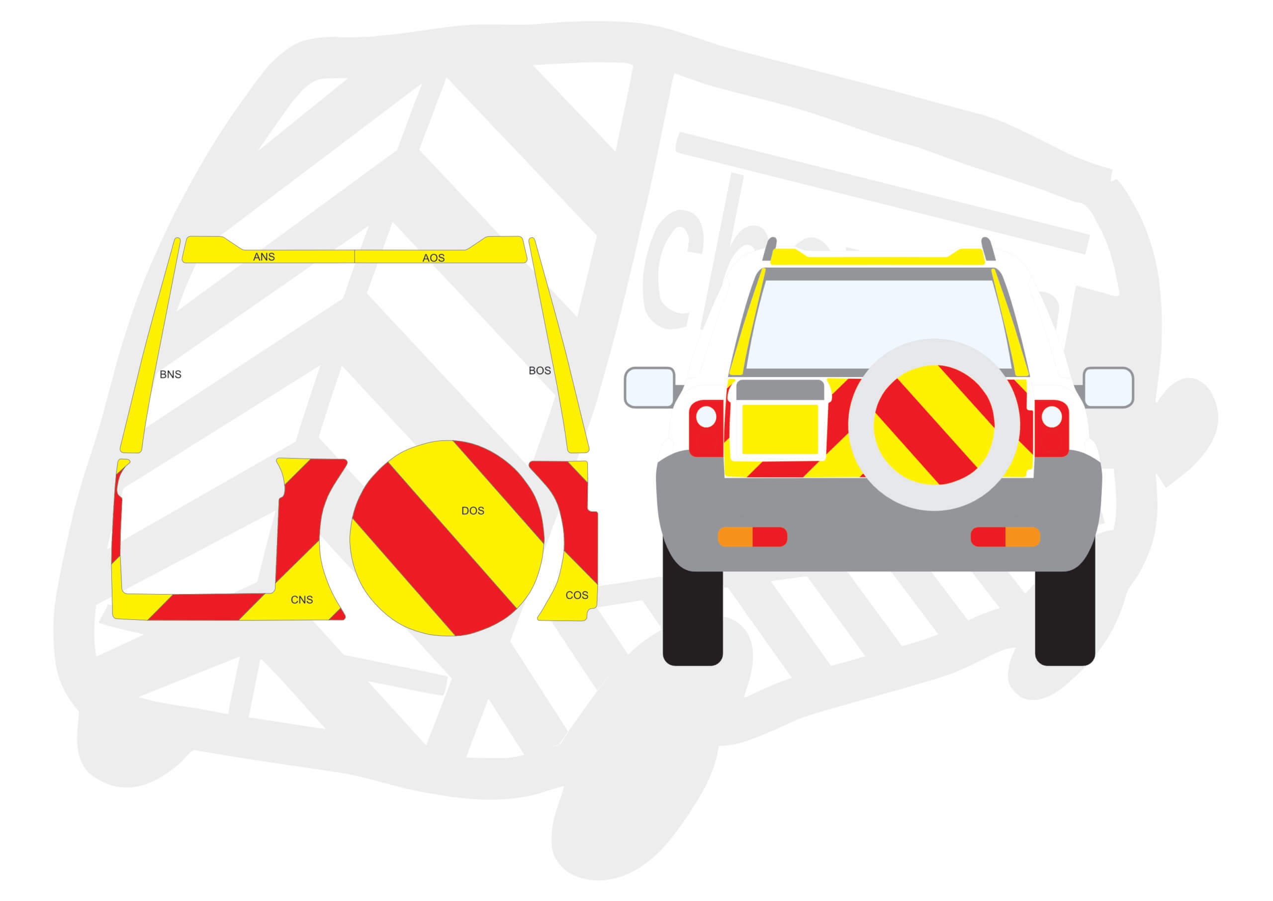 *Our Standard kits are supplied with Full Fluorescent Yellow panels (not individual stripes) with Red Reflective chevrons loosely taped in place. If you require the DIY version – which is 150mm alternate stripes loosely taped together please select the DIY KIT for a reduction in price. Material options will still need to be selected.