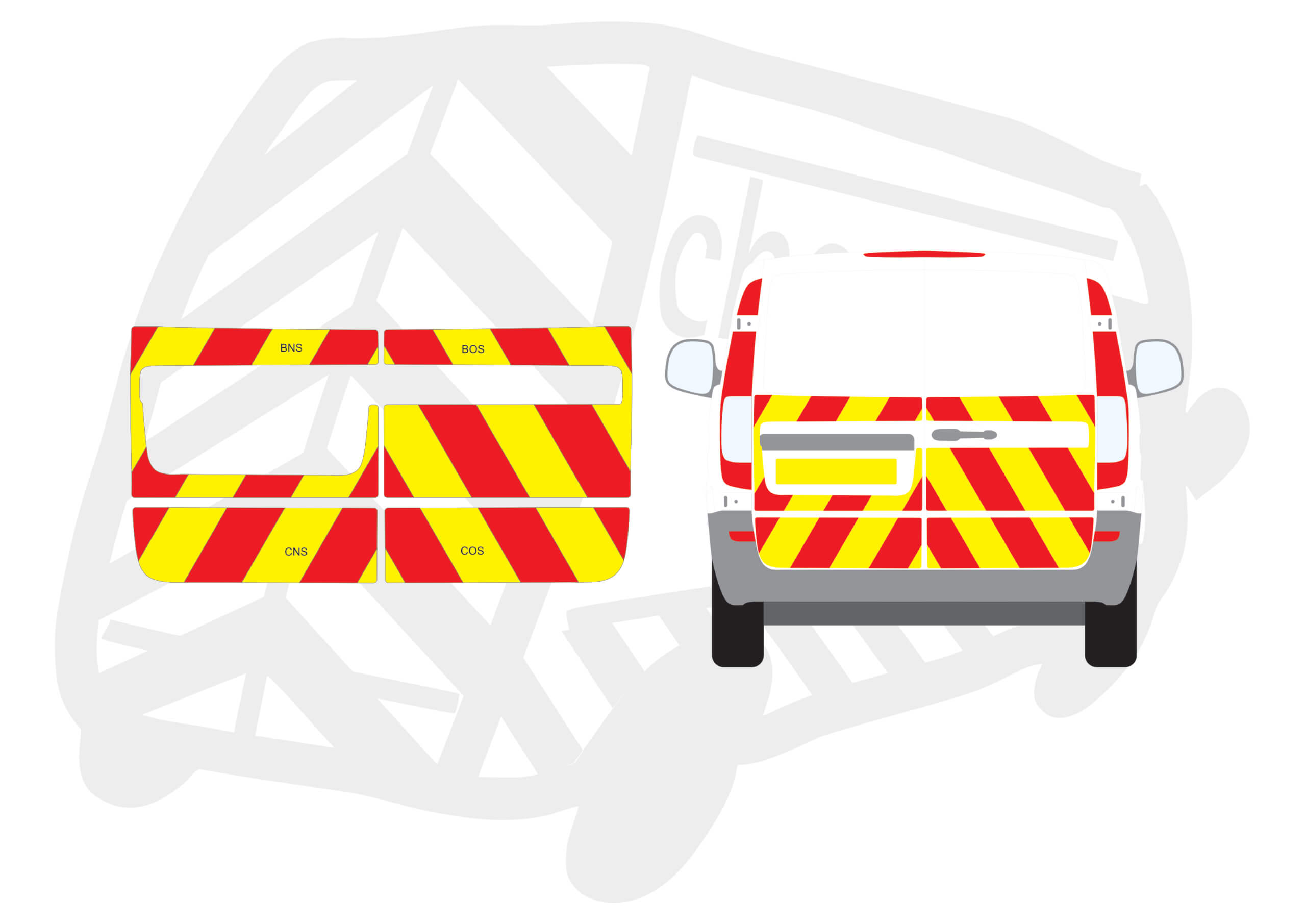 (Standard Kit) Below windows only of 150mm Chevrons in Fluorescent Yellow and Engineering Grade Red Reflective.