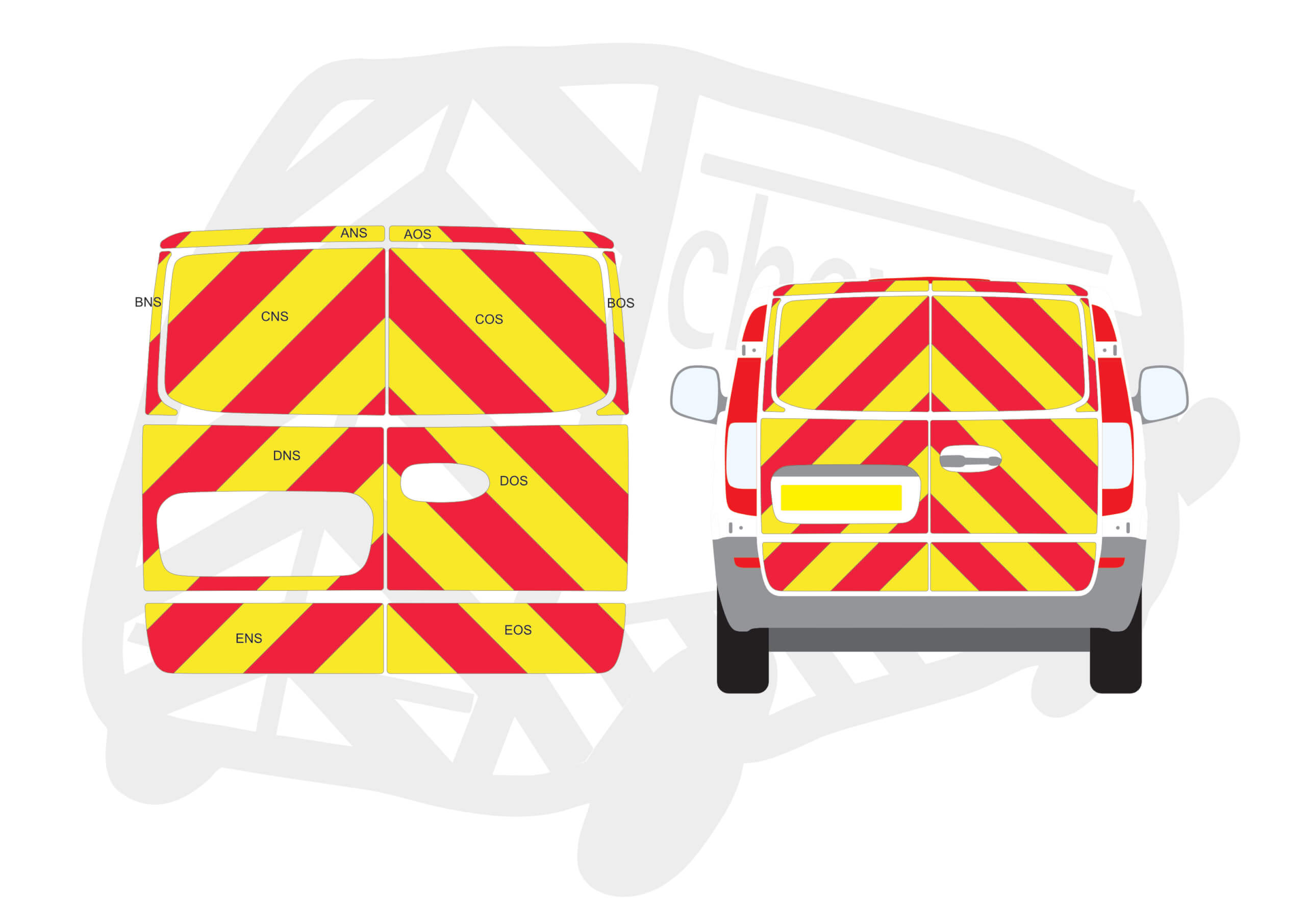 (Standard Kit) Full coverage including windows of 150mm Chevrons in Fluorescent Yellow and Engineering Grade Red Reflective.