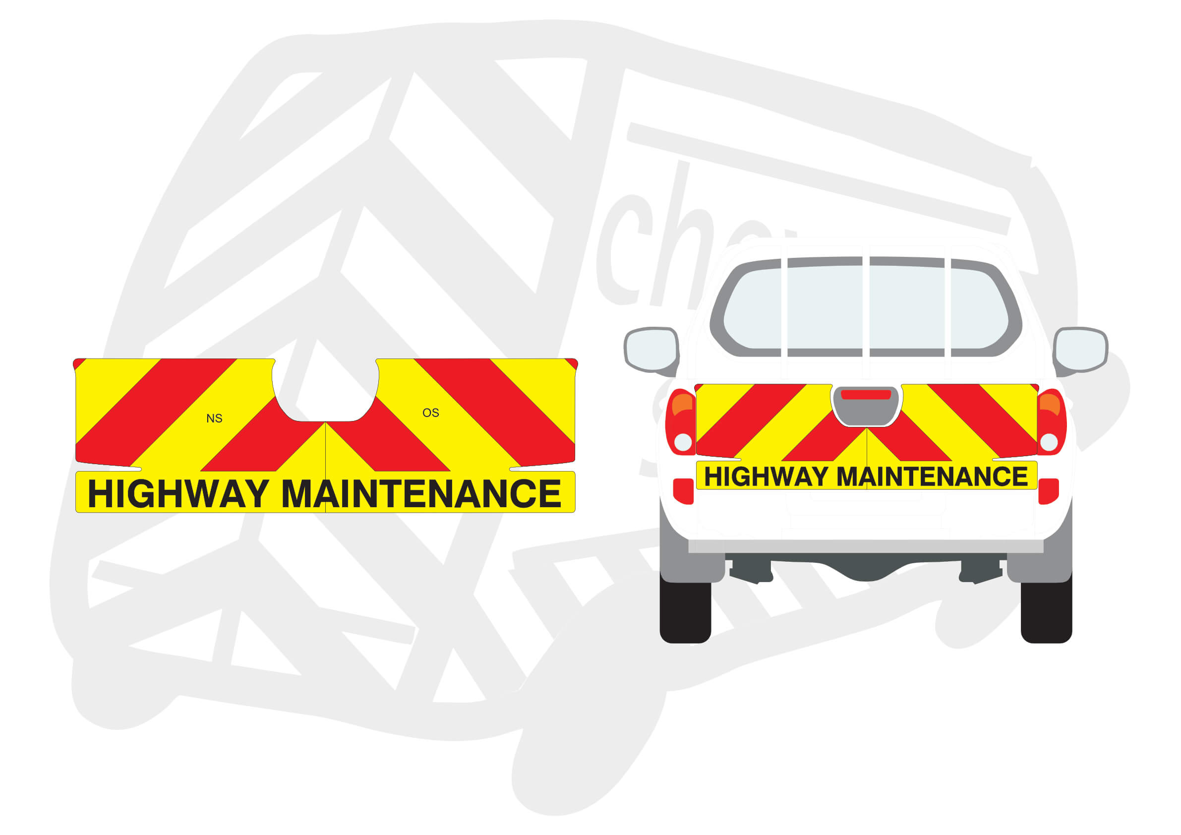 (Standard Kit) Below windows only of 150mm Chevrons in Fluorescent Yellow and Engineering Grade Red Reflective, incorporating ‘Highway Maintenance’ text in black gloss non-reflective.
