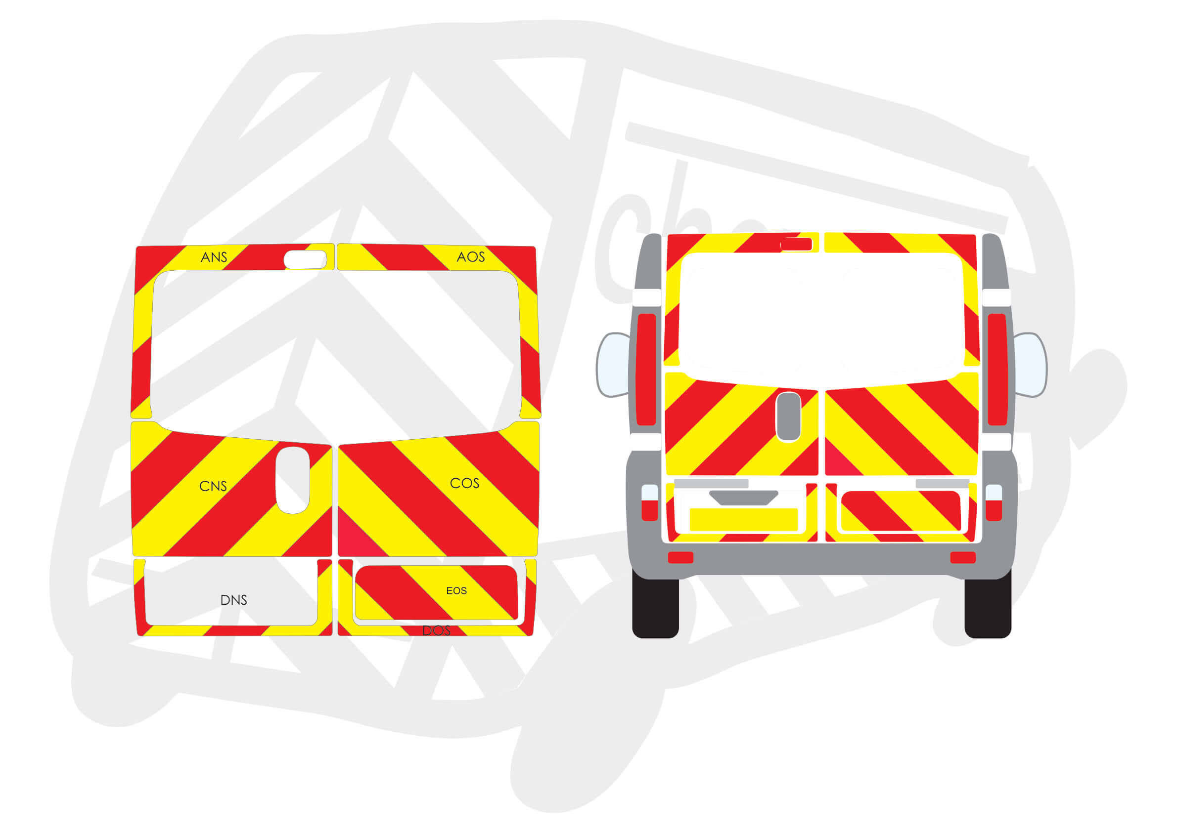 (Standard Kit) Up to windows and surrounds in Fluorescent Yellow and Engineering Grade Red Reflective chevrons.
