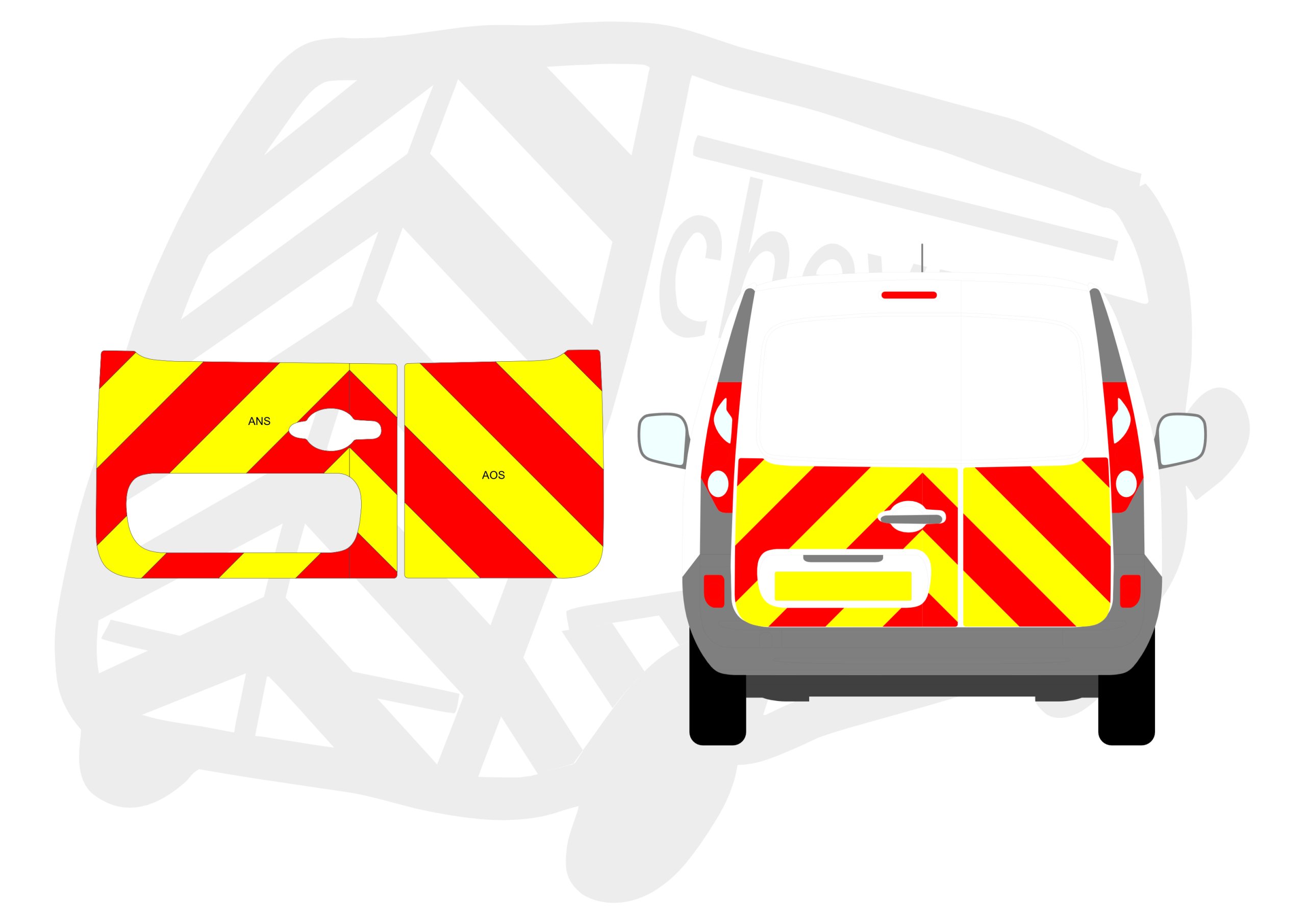 (Standard Kit) 150mm rear chevrons up to windows only in Fluorescent Yellow and Engineering Grade Red Reflective.