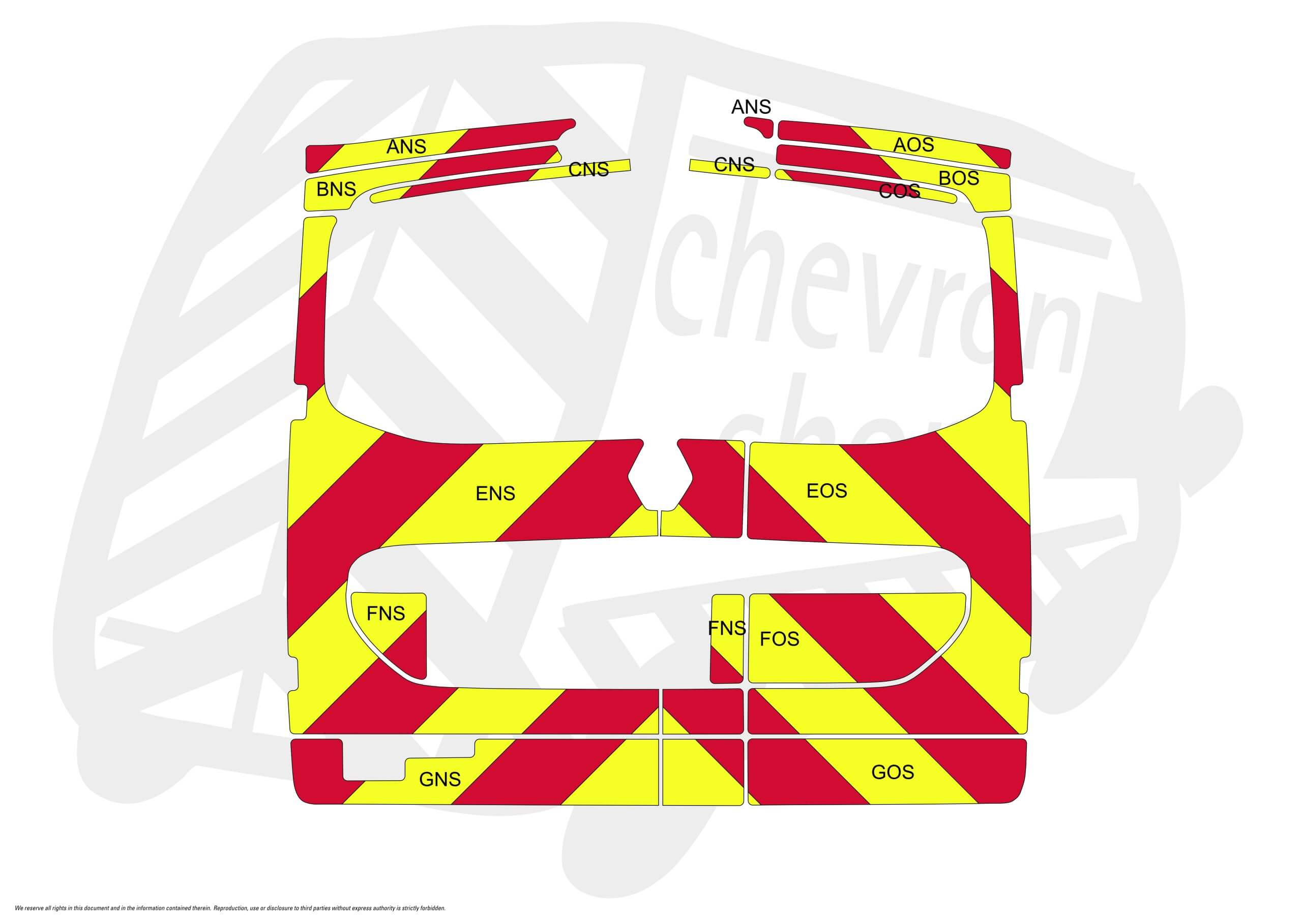 (Standard Kit) 150mm rear chevrons up to windows and surrounds in Fluorescent Yellow and Engineering Grade Red Reflective.