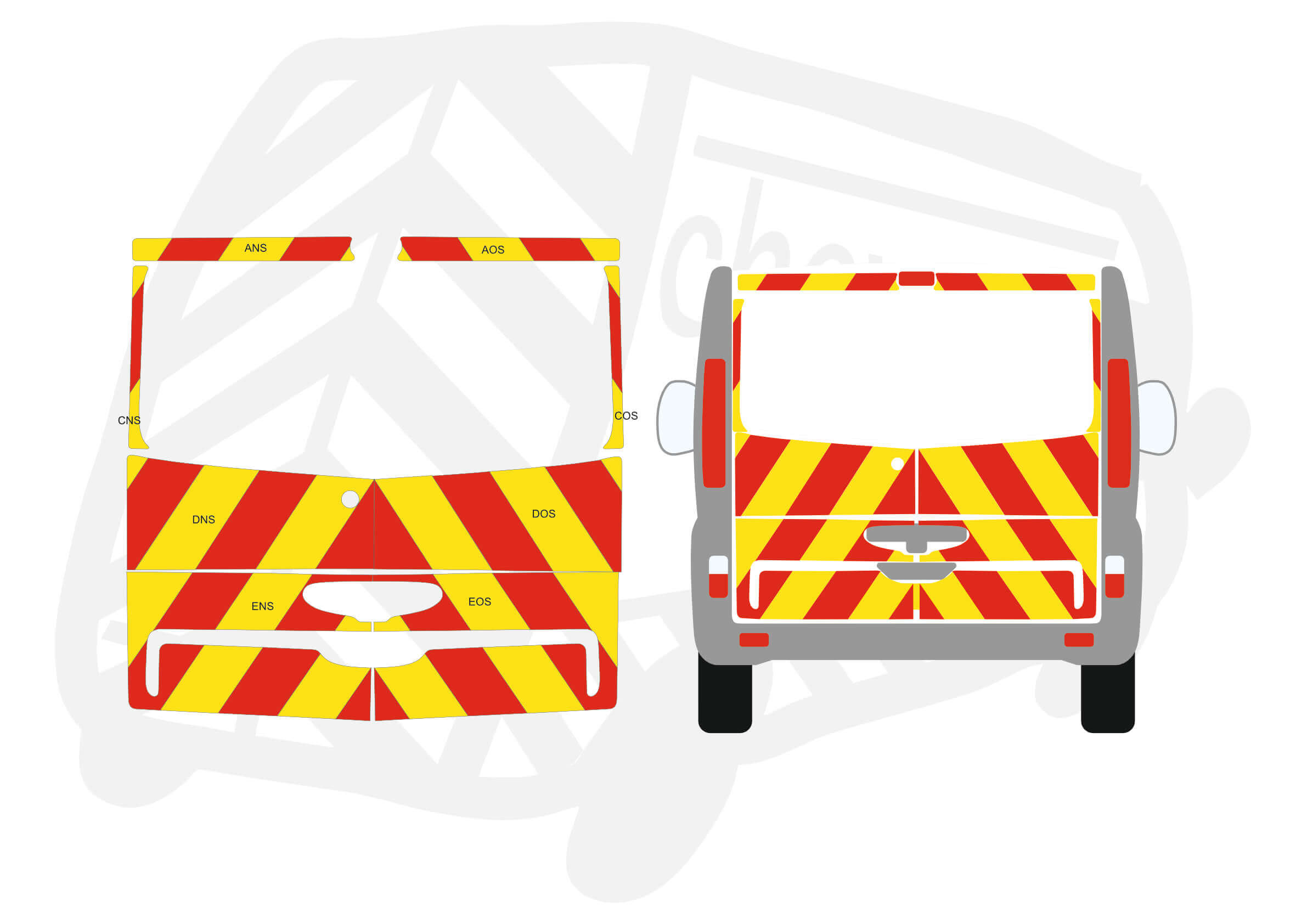 (Standard Kit) Up to windows and surrounds in Fluorescent Yellow and Engineering Grade Red Reflective chevrons.