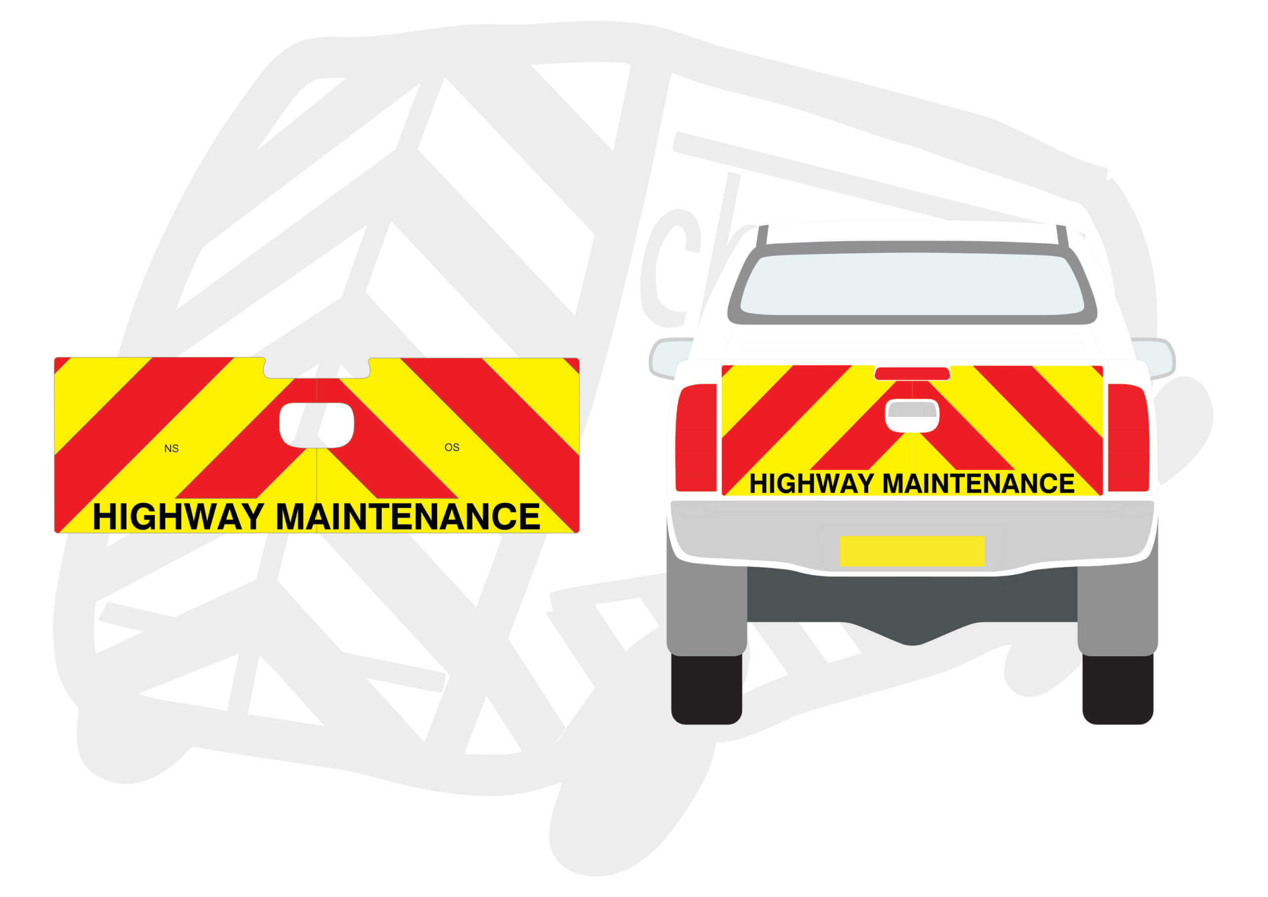 (Standard Kit) Tailgate chevrons of 150mm Chevrons in Fluorescent Yellow and Engineering Grade R1 Red Reflective.. Handle cut out only. Incorporating ‘Highway Maintenance’ text in black gloss non-reflective.