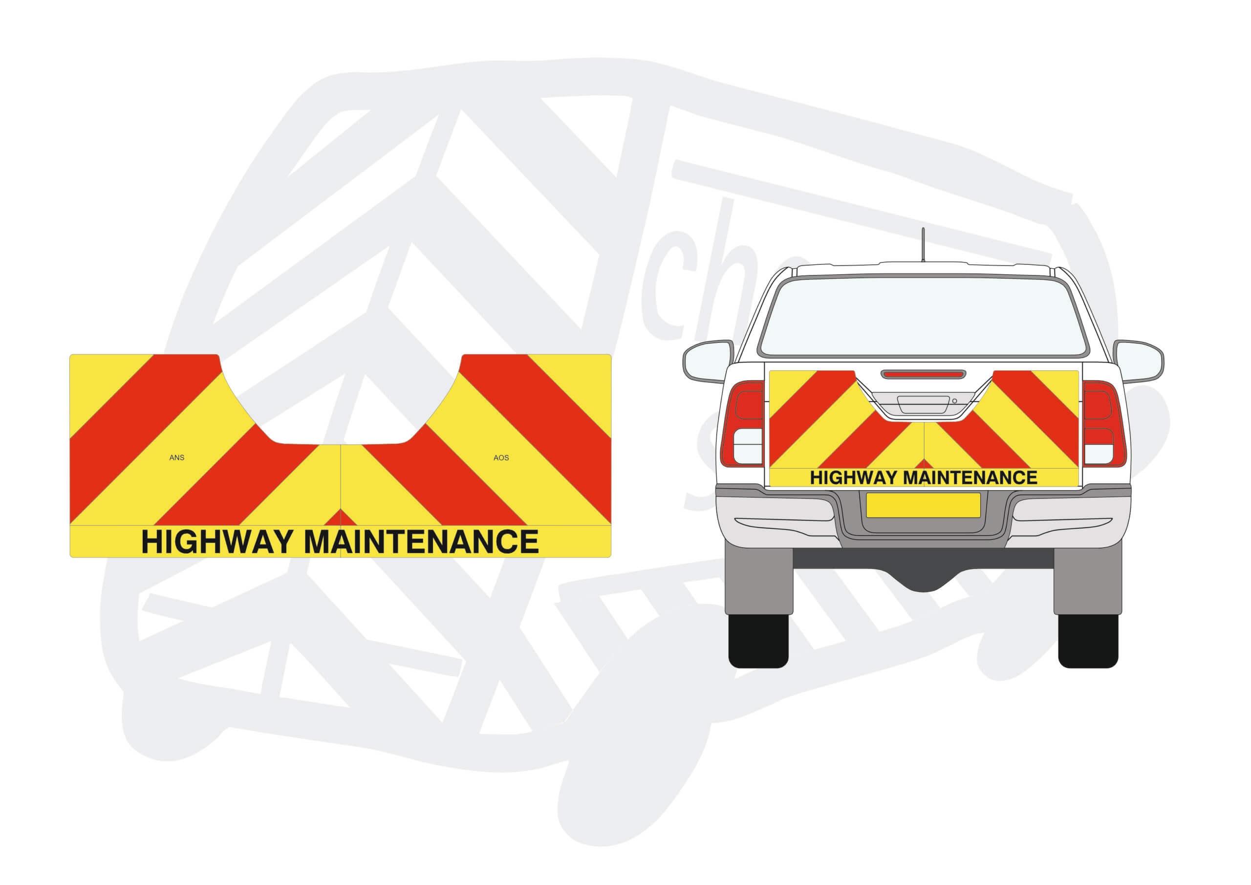 (Standard Kit) Tailgate chevrons of 150mm Chevrons in Fluorescent Yellow and Engineering Grade R1 Red Reflective, to incorporate ‘Highway Maintenance’ text in black gloss non-reflective.
