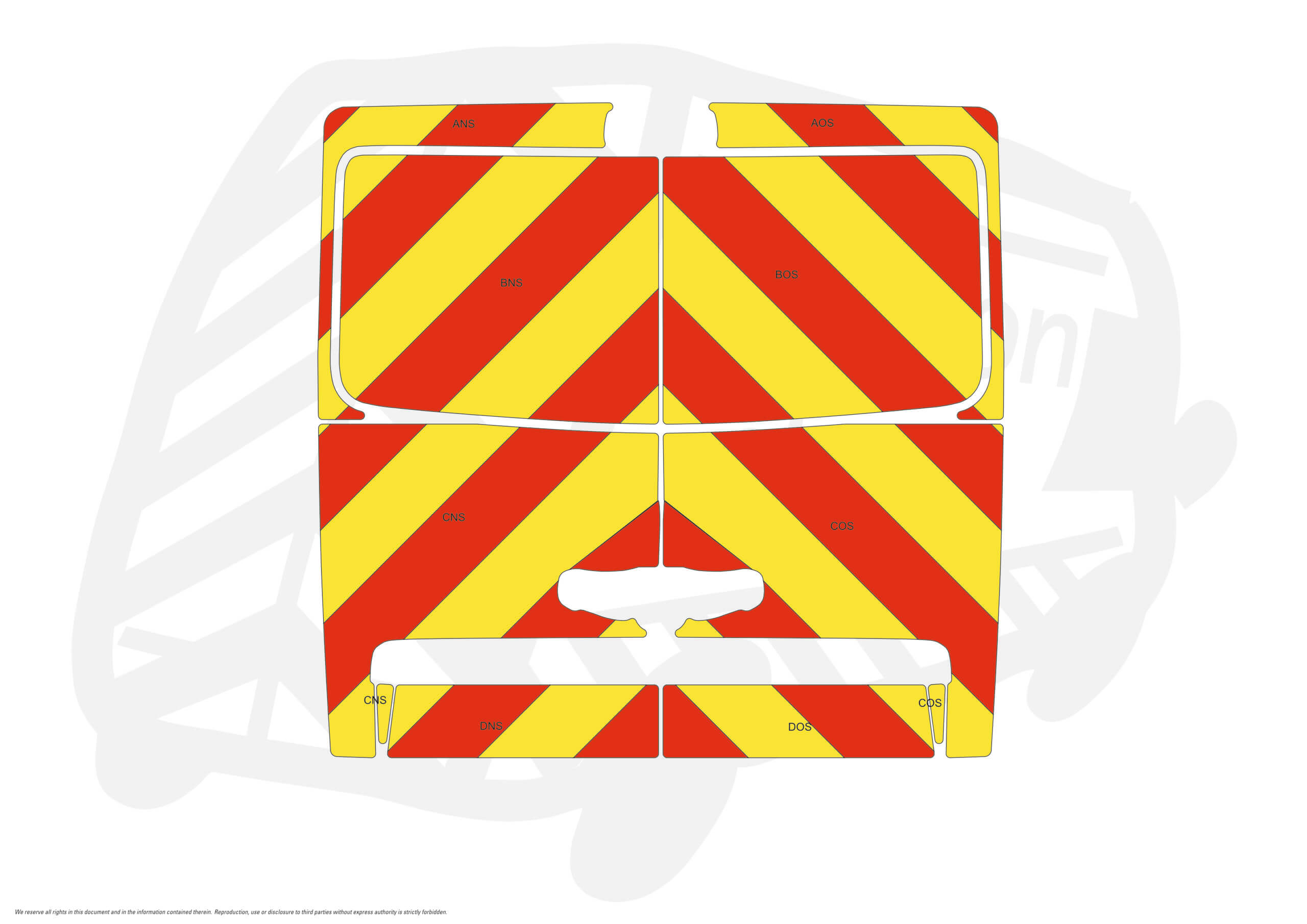 (Standard Kit) Below windows and surrounds of 150mm Chevrons in Fluorescent Yellow and Engineering Grade R1 Red Reflective. No badge cutout.