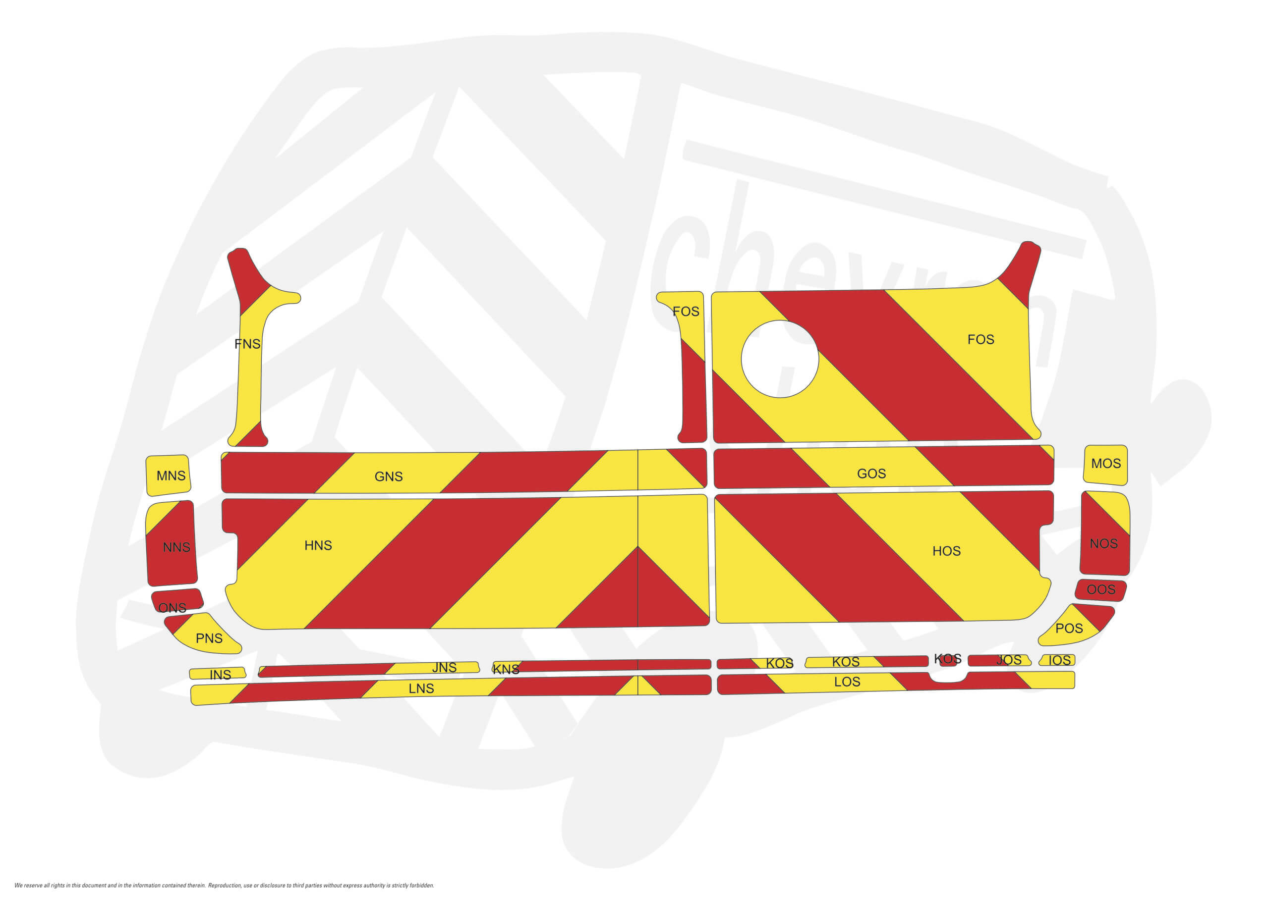 (Standard Kit) Below windows only of 150mm Chevrons in Fluorescent Yellow and Engineering Grade R1 Red Reflective.