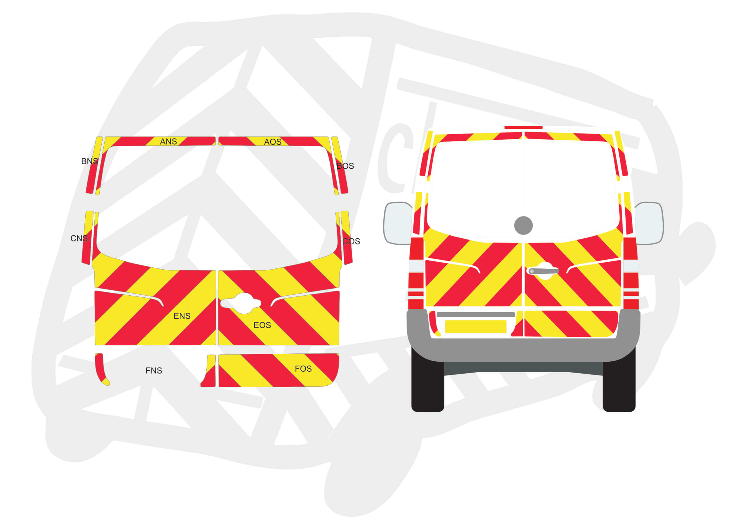 (Standard Kit) Below windows and surrounds of 150mm Chevrons in Fluorescent Yellow and Engineering Grade Red Reflective.