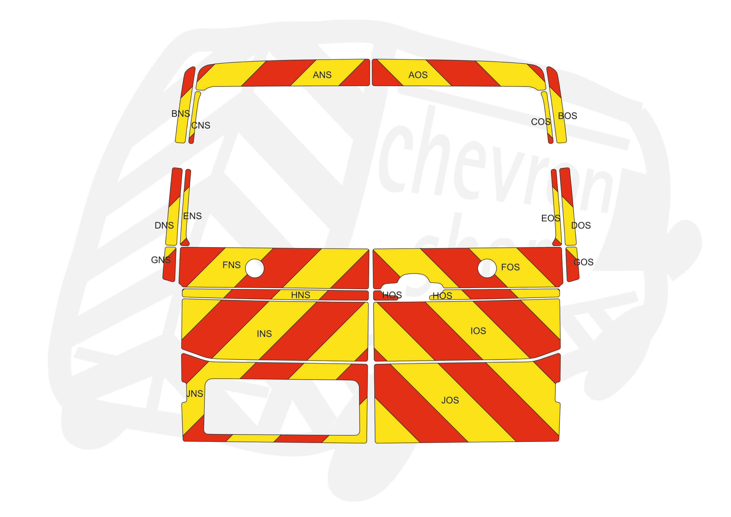 (Standard Kit) Below windows and surrounds of 150mm Chevrons in Fluorescent Yellow and Engineering Grade R1 Red Reflective.